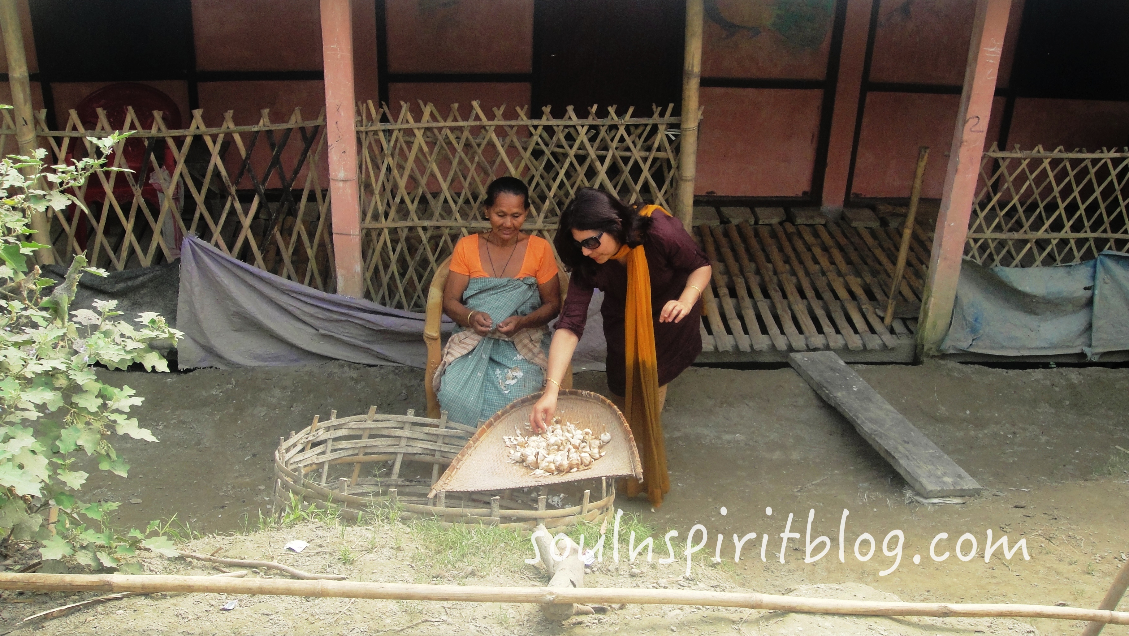I loved the tribal touch ! Though this place is also famous for the vaishnava satras ( centre of education and cultural significance) but that was one part of sight seeing. I enjoyed spreading grains under the sun, removing dry peel from garlic bulbs or to just roam around the place to soak in the fun. It was a perfect date with Majuli people !!!