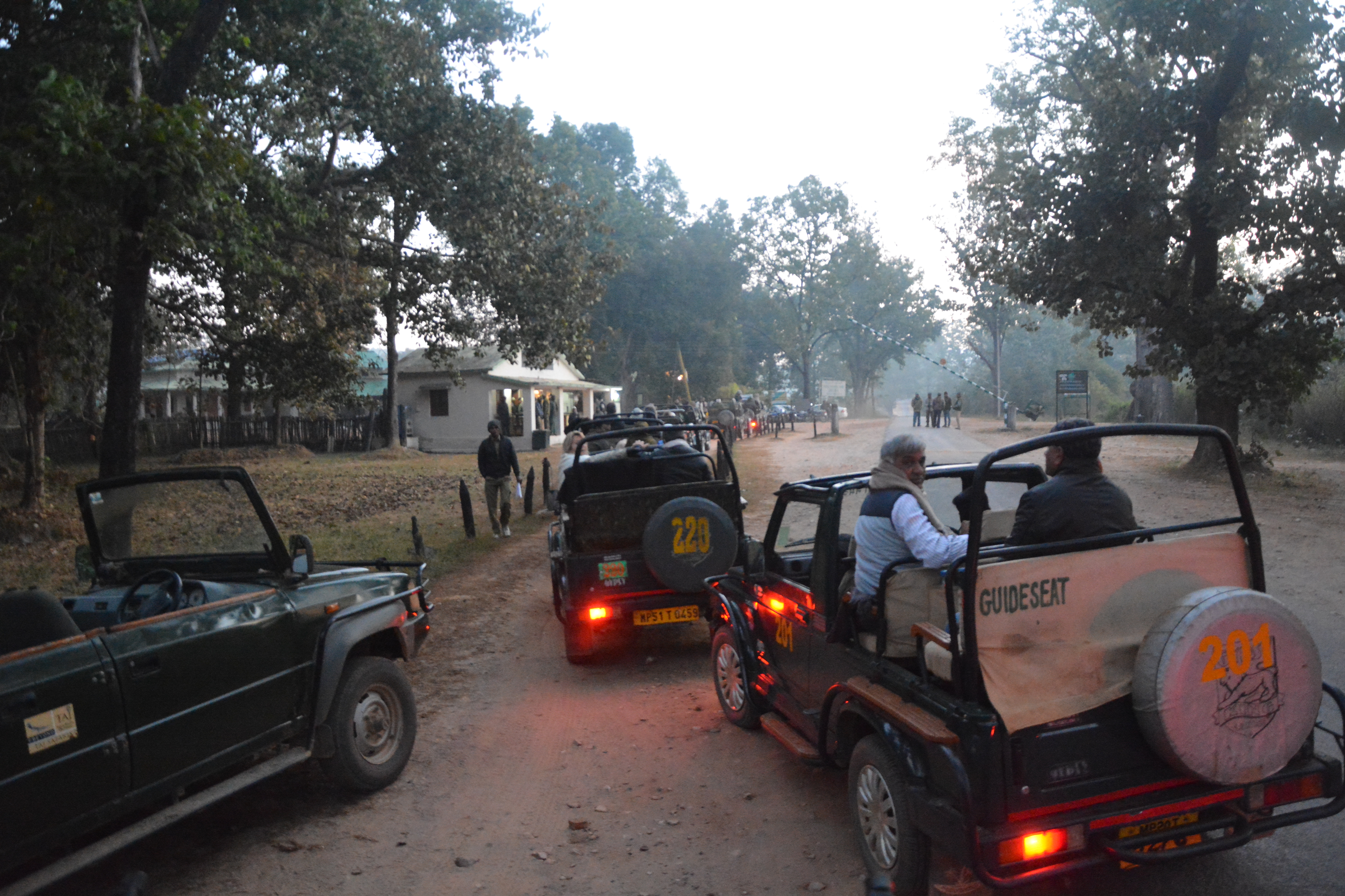 With excitement writ large on our face we got ready to board the gypsy for our foray into Jungle Safari at Kanha and left Chitvan at 0530h. It’s a 15 minutes drive to Mukki gate were our credentials were checked and a guide of the forest dept boarded our gypsy. While we were waiting in queue there was a commotion followed by loud noises, shouting and a forest ranger gypsy whirl past in a hurry – the reason for this heightened activity was that a Tiger was spotted outside the jungle fence pretty close and forest staff was cautioning all the visitors to remain in their gypsy vehicles. The area was flushed with excitement – was this going to be our first sighting even before we’ve entered the forest !!!