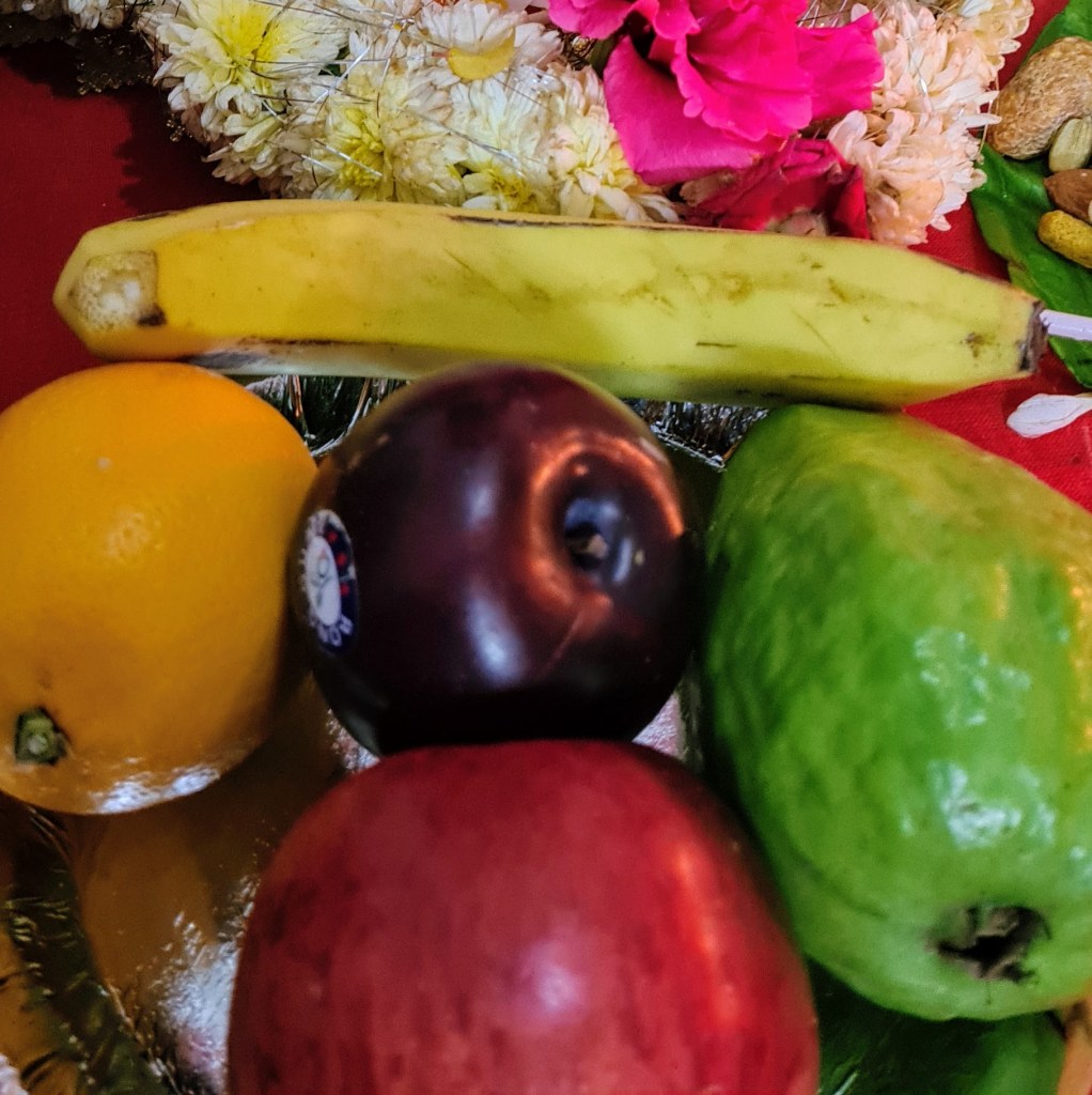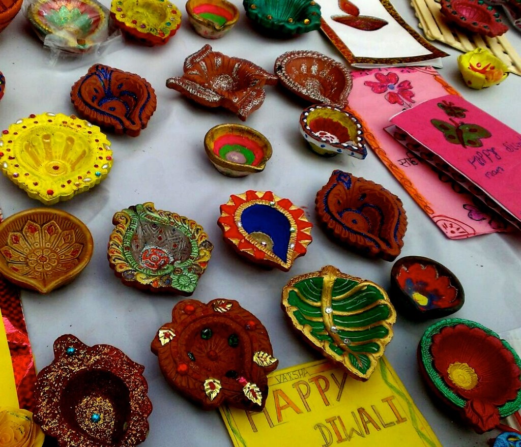 This picture was clicked during our school Diwali Fest, where colourful diyas, wall hangings, and candles in all shapes and sizes, made by students were displayed for parents to appreciate and buy as a token of reward to budding artists. The floating leaves are from my lotus pond and fruits from my temple offerings for God.