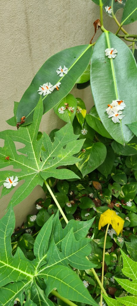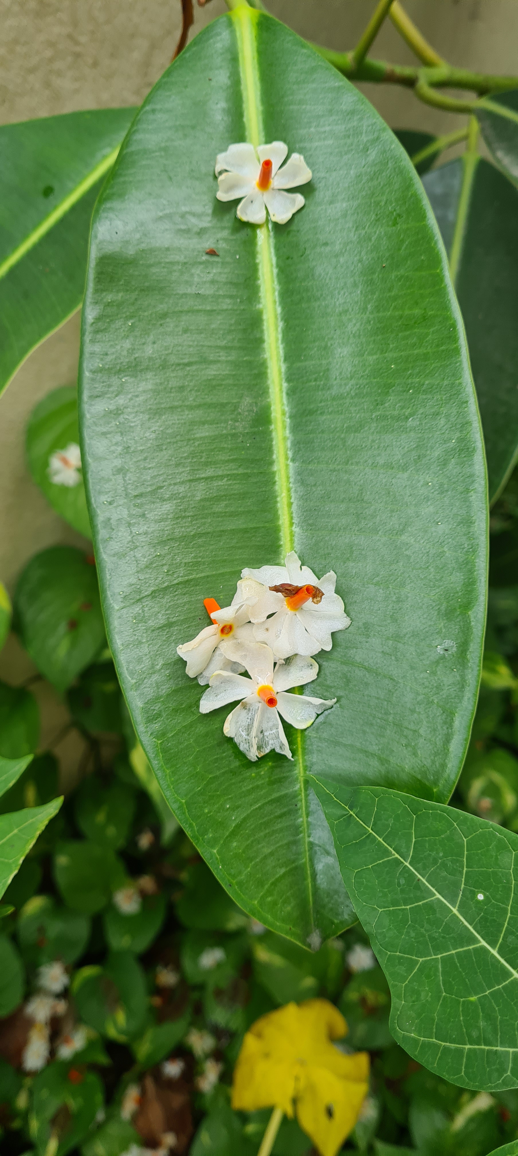 I have a huge one in my backyard. The first thing I do in the morning is to collect the flowers for my temple and corner decorations. The flowers have six to eight petals on an orange stem. They start withering as the day passes by. A medicinal plant having huge health benefits. The leaves and flowers are used for many recipes. many dishes and herbal teas are prepared in different parts of India however mainly used for spiritual purpose. Scientific name is Nyctanthes arbor-tristis.