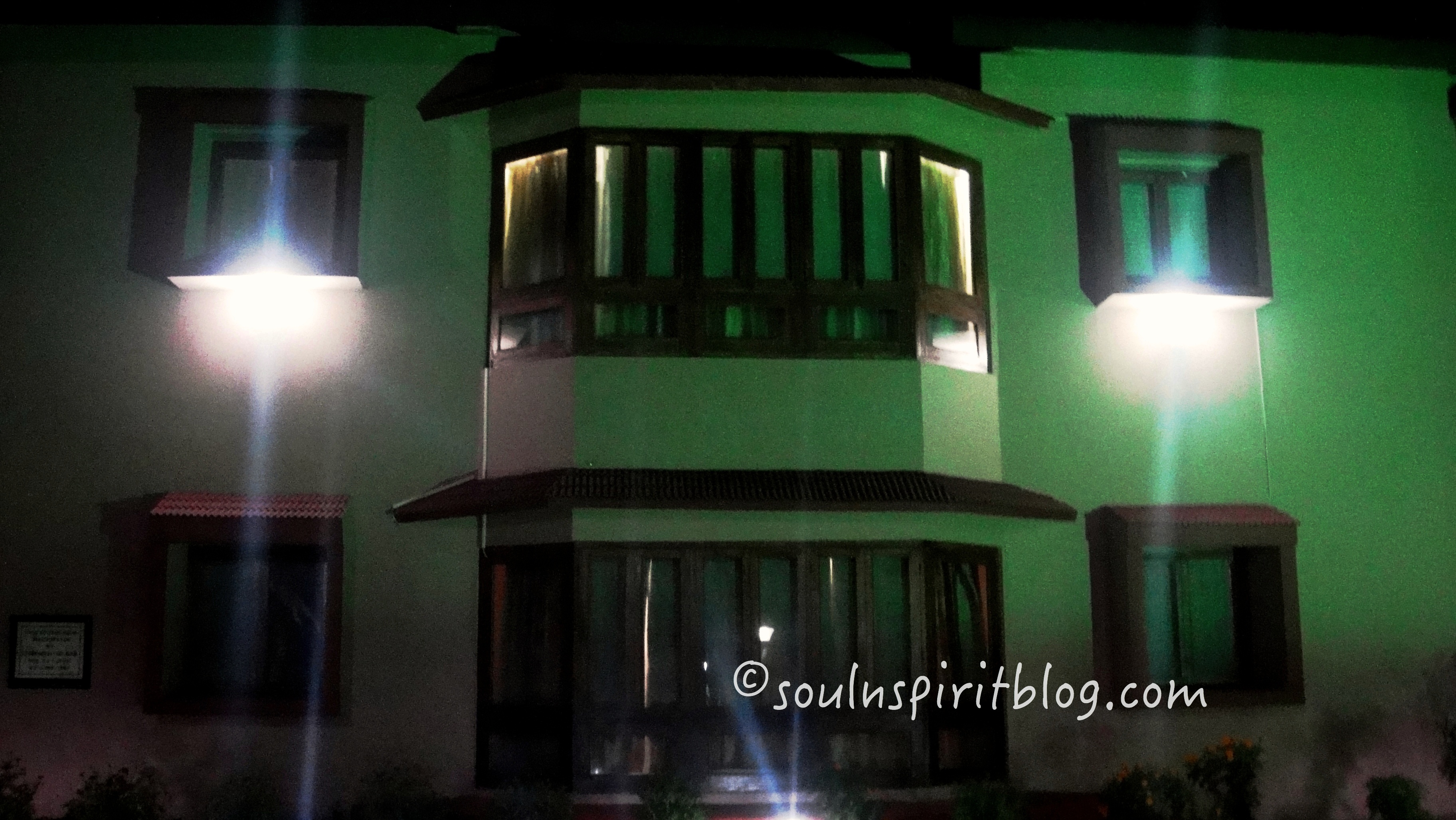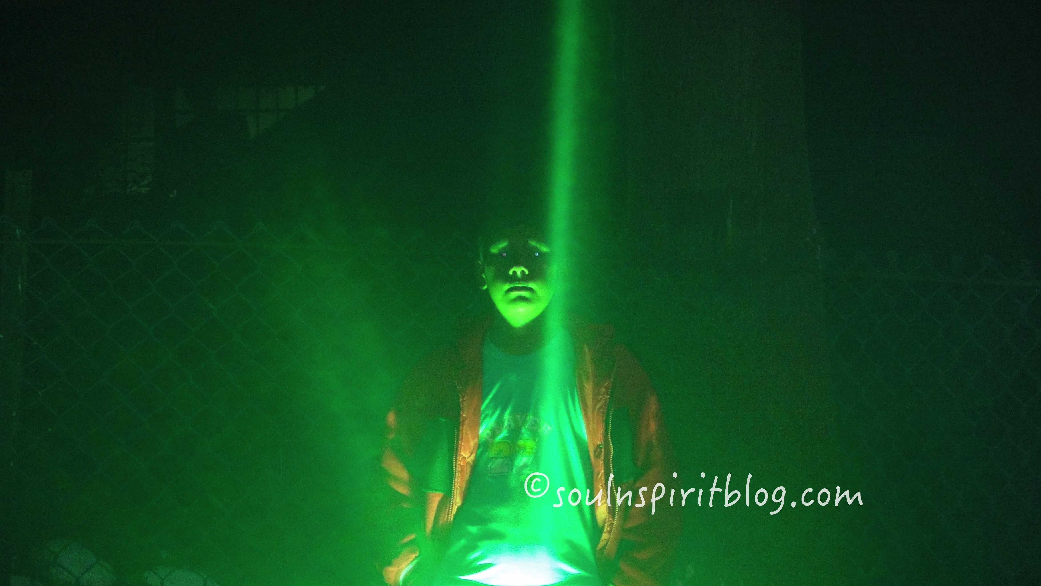 Everything is a mystery here. a ghastly figure with a hood,  a bungalow, looking spooky in green light adds to the mystery of this place.